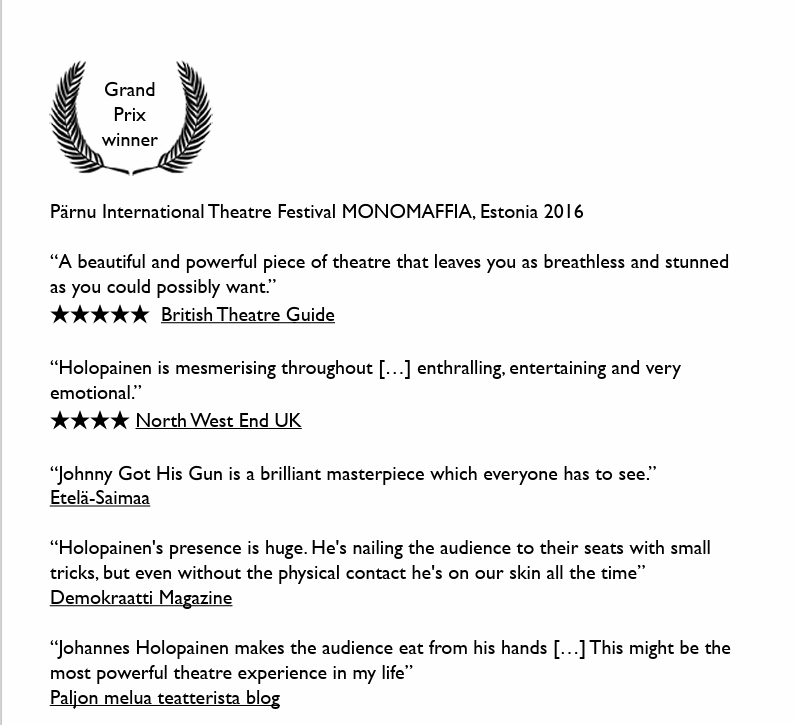 Johannes Holopainen is a Finnish actor with a diverse career encompassing theater, film, and television. Helsinki-born Holopainen studied acting at the University of Arts with an MA in Theater Arts. Holopainen has performed in leading drama, comedy, and musical theater roles around Helsinki, including The National Theater and KOM-Theater. The monologue Johnny Got His Gun landed him the Grand Prix at Pärnu International Theatre Festival in 2016. Same company’s new monologue performance, The Moustache, runs in Helsinki in fall 2022.